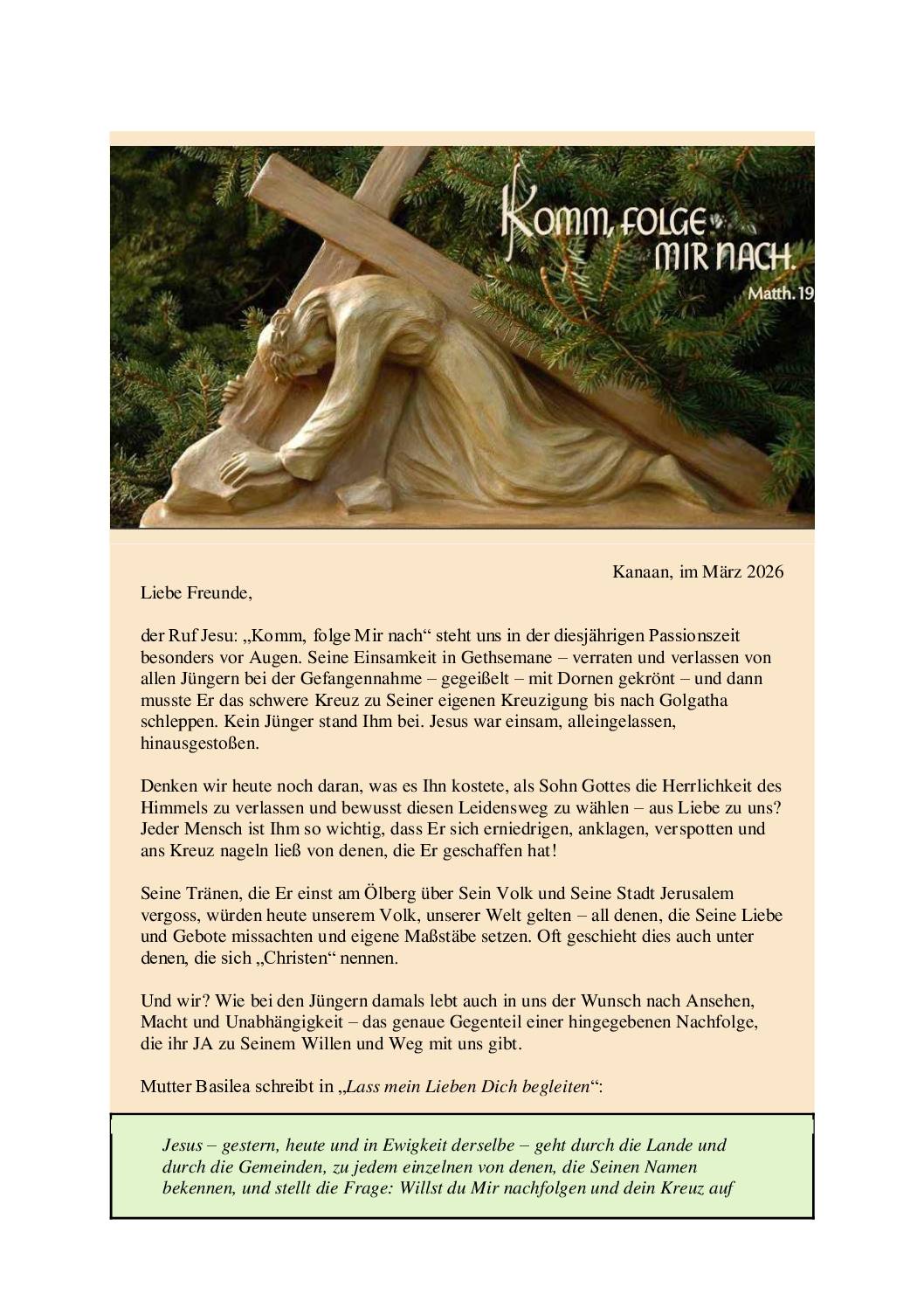 Alle, die Jesu Leiden tiefer erfassen möchten, laden wir herzlich zu einem Besuch auf Kanaan ein: